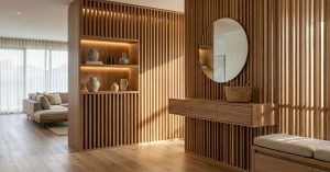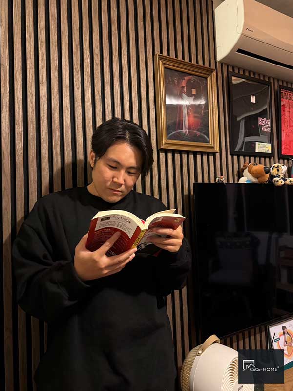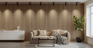客廳原本是很普通的白牆,吸隔音木格柵結果整個空間直接升級 !