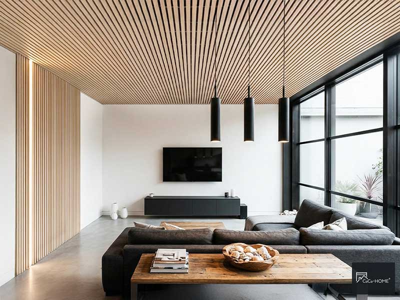 客廳通常是居家中面積最大、天花板最顯眼的空間。白色平頂雖然乾淨,但缺乏視覺重心。把木格柵板鋪設於客廳天花板,能夠立即讓空間多出一層暖色木質調,搭配沙發與地板的材質形成上下呼應,整體質感明顯提升。