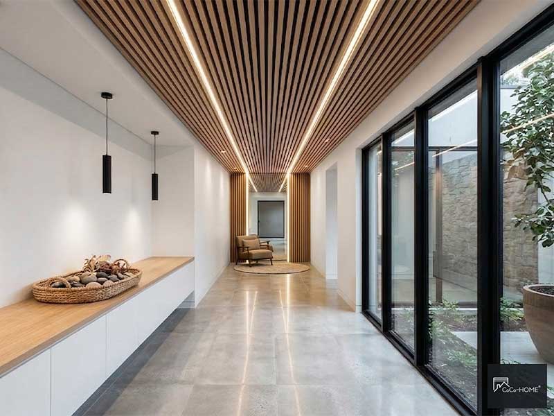 玄關與走道的天花板面積雖然有限,卻是進門後第一眼的視覺落點。木格柵板以縱向平行線條的特性,能夠在視覺上拉伸縱深,讓原本偏窄的走道感覺更為寬敞,也讓進門的第一印象更有設計感。