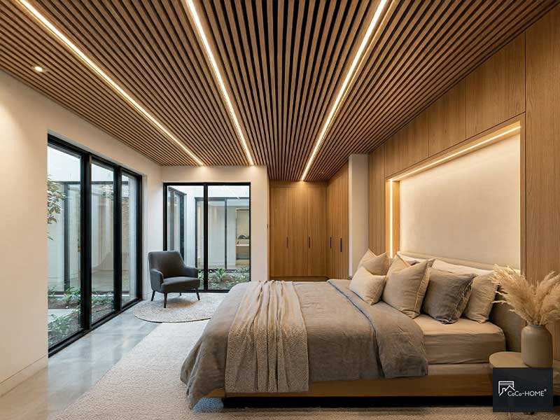 臥室對靜謐度的要求相對高。木格柵板裝在臥室天花板,除了視覺上的溫潤感,木條與吸隔音板的組合也能有效吸收空間中的殘響。夜間搭配嵌入木條縫隙之間的燈條,光線透過格柵縫隙漫射,氛圍極為出色。
